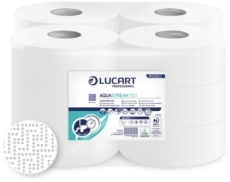 Vízben azonnal oldódik EcoLabel címke hófehér 2 rétegű, 19 cm átmérő, 150 m 12 tekercs/csomag A papír, amely vízben néhány másodperc alatt szétoszlik, védve dugulások ellen Az AquaStream a Lucart Professional új tissue-papír termékcsaládja, amely hatékony a WC csövekben kialakuló dugulások megelőzésére.