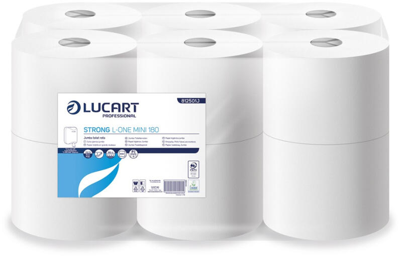 Lucart Toalettpapír 2 rétegű közületi átmérő: 18, 2 cm laponkénti adagolás 12 tek/csom Strong L-One Mini Lucart_812501J hófehér (812501J) - iroda-ellatas
