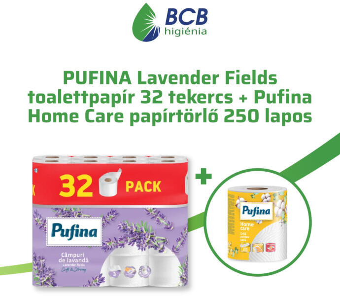 Pufina Lavender Fields toalettpapír 100% cell 32 tek 140 lap 3 rétegű, levendula illatával + ajándék Pufina Home Care 245 lapos papírtörlő