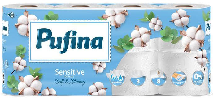 Pufina Toalettpapír, 3 rétegű, kistekercses, 8 tekercs, PUFINA Sensitive Aquabond, illatmentes (KHH864) (KHH864)