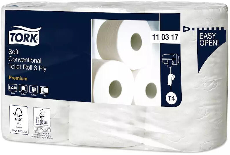 Tork Toalettpapír T4 Kis Tekercses Premium Soft, 3 Réteg, Hófehér, 35 m/Tekercs, 248 Lap, 6 Tekercs/Csomag,