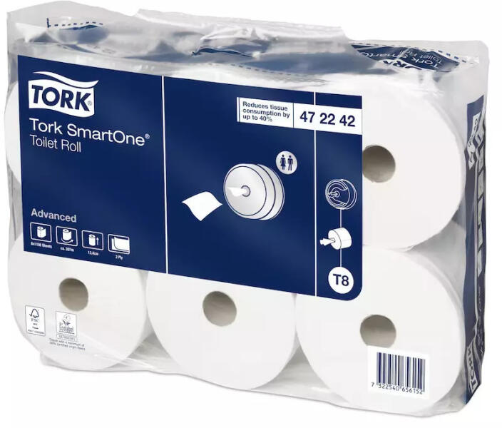 A Tork SmartOne® toalettpapír adagoló rendszer higiénikus laponkénti adagolást biztosít, így a fogyasztás akár 40%-kal csökkenthető a hagyományos Jumbo toalettpapír adagolókhoz képest, vagyis egy tekercsre több felhasználó jut. A Tork SmartOne® nagy teljesítményű tekercsek alkalmazását nagy fogyasztású, forgalmas mosdókba ajánljuk.