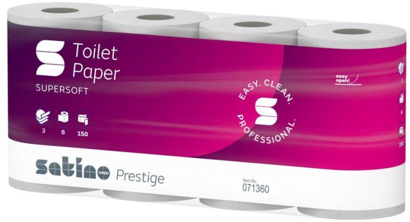 Satino Prestige Wepa toalettpapír 3 rétegű, fehér, 150 lapos, 8 tekercs/csomag, 8 csomag/zsák