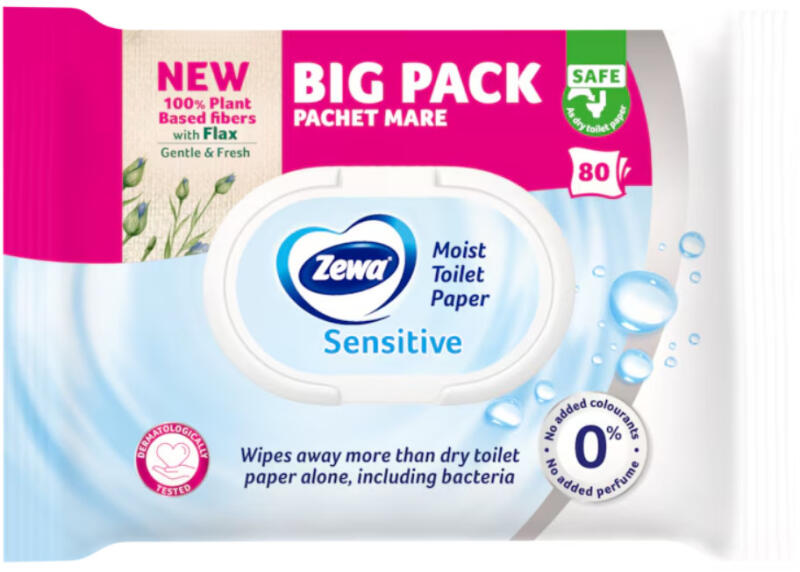 Zewa Sensitive nedves toalettpapír bőrsemleges pH-val színezék nélkül, mely gyengéd a bőrhöz. Biológiailag lebomlik, így bátran dobja be a toalettbe is, hiszen ezek a nedves Wc papírok lehúzhatók. Visszazárható fedéllel. Jellemzői: