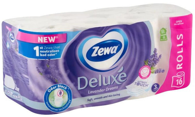 A Zewa Deluxe Lavender Dreams , levendula illatú 3 rétegű toalettpapír . A wc papír kellemes levendula illatot áraszt a mellékhelyiségben. Ez a fehér wc papír gyengéd puhasággal biztosítja bőrének az alapvető gondoskodást. A dombornyomású Zewa-embléma pedig elismert minőségük garanciája. A Zewa toalettpapír tökéletes választás mindennapi használatra. Ráadásul az egyetlen WC-papír, amelynek lehúzható gurigája azonnal feloldódik a lefolyó vizében.